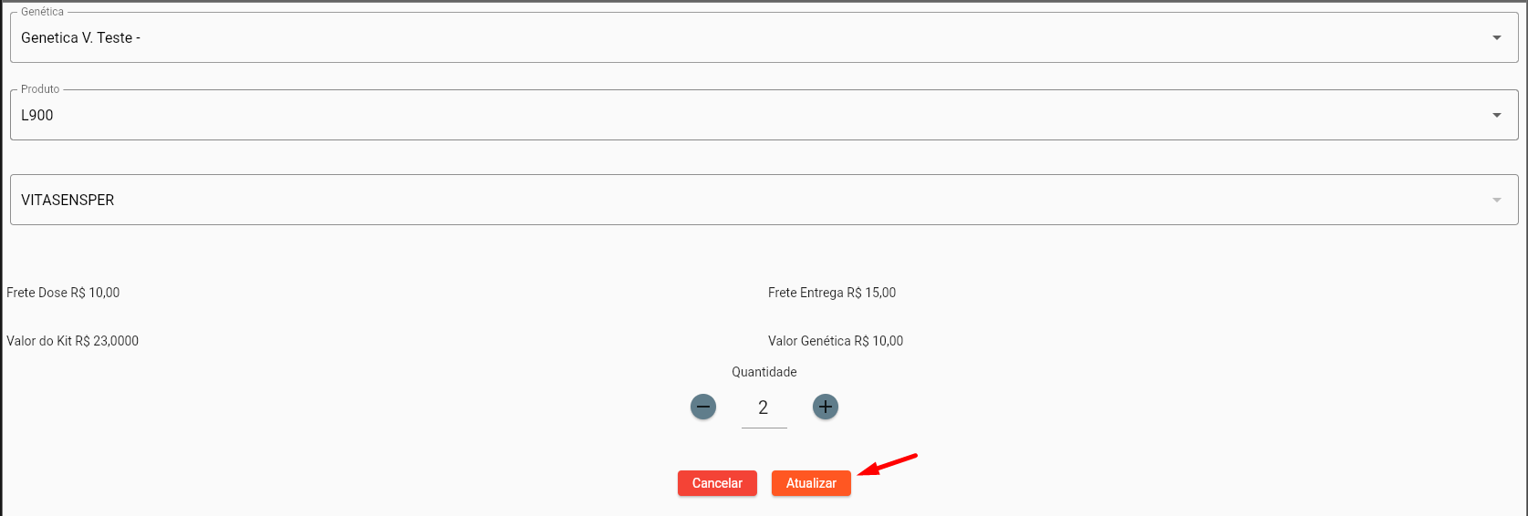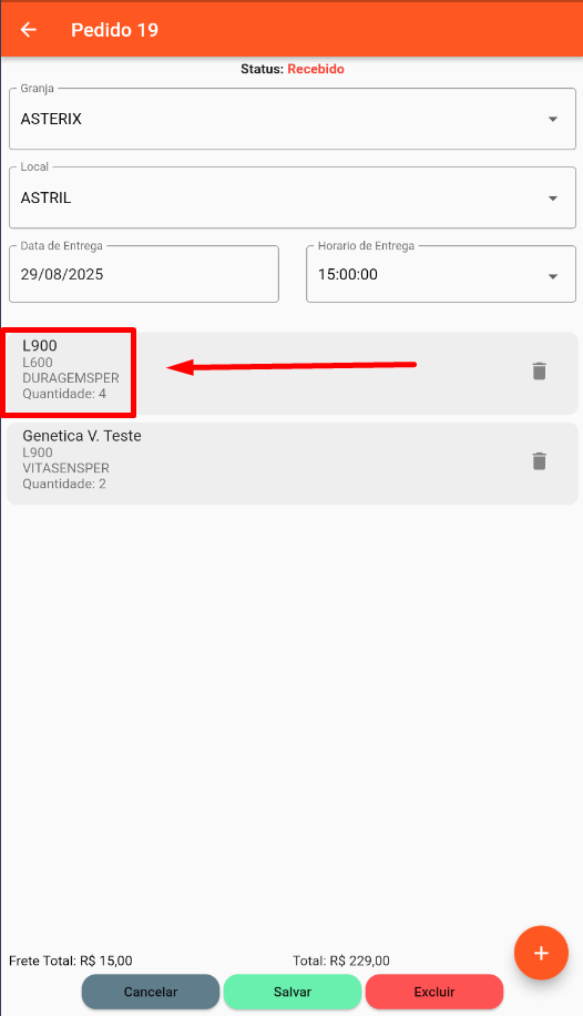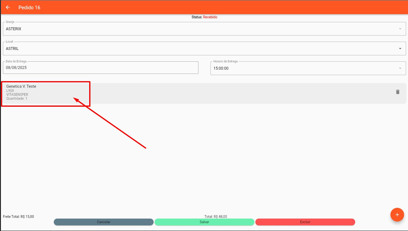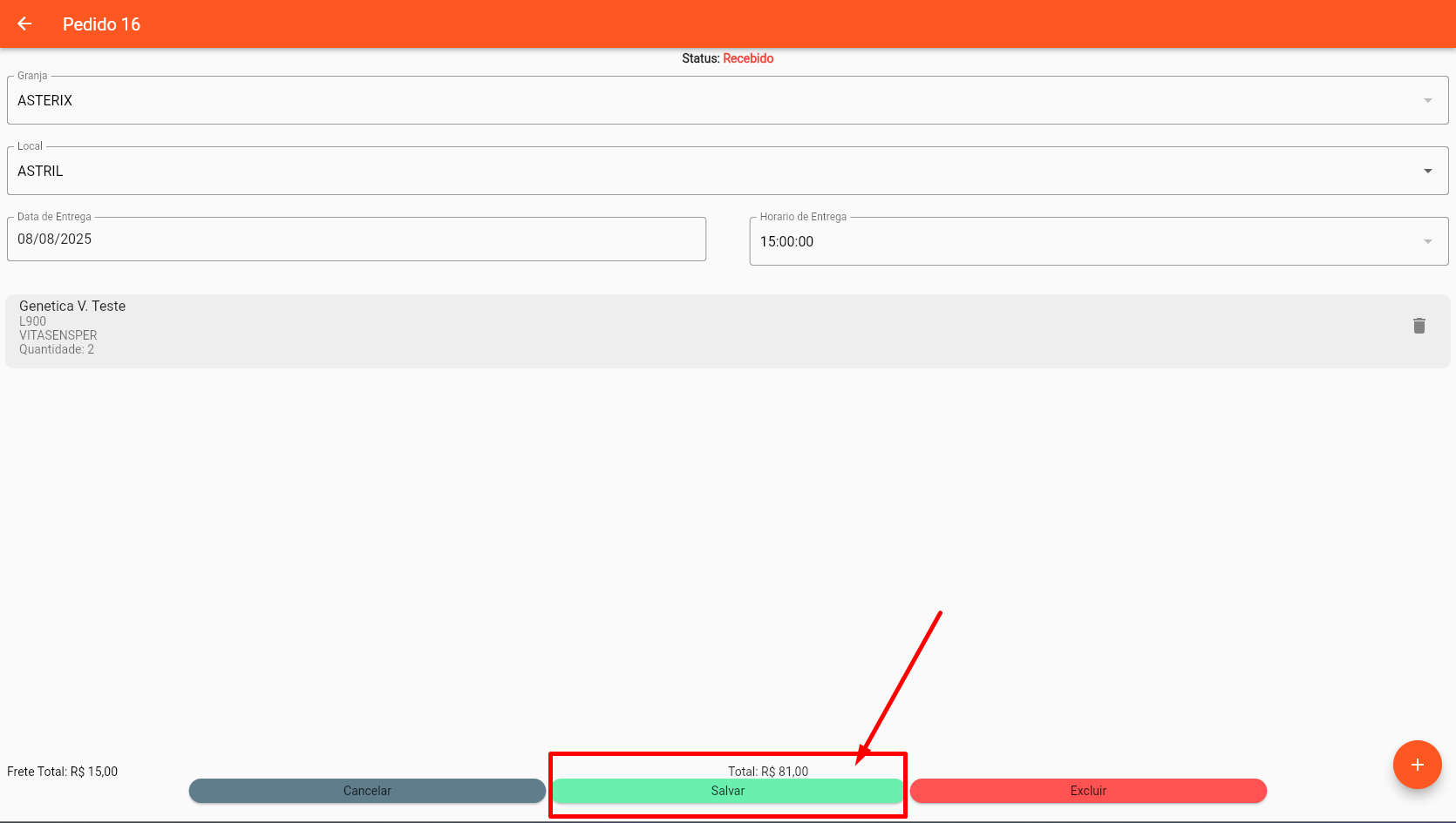 Após salvar as alterações, o pedido será atualizado na lista principal com as novas informações e valores recalculados.